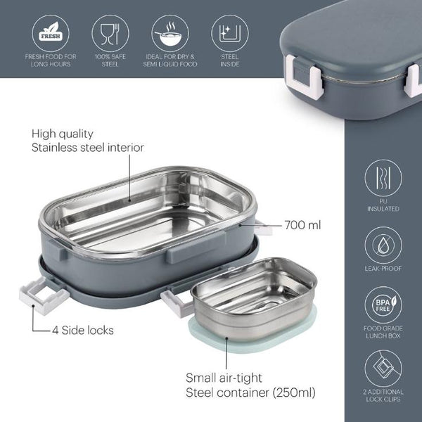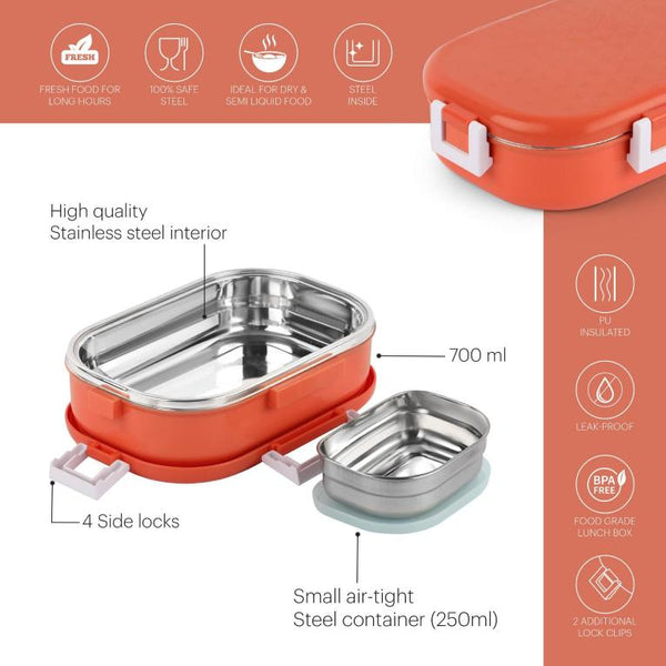 Introducing the Altro Neo Insulated Lunch Box for Kids in delightful pastel shades, designed to make mealtime a breeze. With its charming textured lid and compact build, this lunch box is both stylish and functional. Inside, you'll find a convenient small steel container and extra clip locks, ensuring your child's meal stays secure. Crafted from top-grade stainless steel, the thermoware construction guarantees 100 percent leak-proof performance, while the exceptional insulation keeps food delightfully fresh for extended periods. Safety is paramount, as the box is made from 100 percent food-grade, BPA-free virgin plastic and is dishwasher safe.