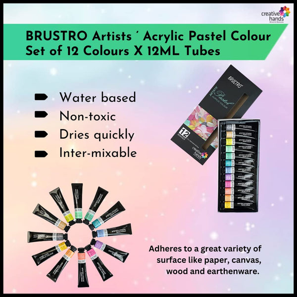 Brustro acrylics are colours that can be used to paint on all conventional art surfaces such as paper, cardboard, canvasses etc. These soft bodied colours can be used straight from the tube as they wet easily on to the surface, or they can be thinned with water. All the colours are inter-mixable giving endless colour possibilities. Contains Tuscan Sun, Peach, Coral, Bubblegum, Lavender, Cornflower Blue, Teal, Mint Green, Pistachio Green, Lime Green, Sand and Fossil.