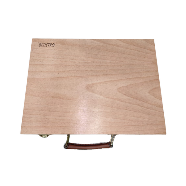 Strong, durable and portable wooden box for storing art supplies with a removable wooden palette and five storage compartments.