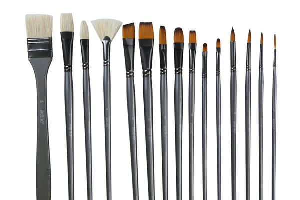 FOR OIL ACRYLIC AND WATERCOLOUR WORKS FOR ALL PAINT TYPES - This brush set can be used for oil paints, acrylic paints and even water colour paints; these brushes are also very versatile as there a mix of 4 natural hog hair bristle brushes and 11 synthetic bristle brushes to create the brush strokes you need. SPEND MORE TIME ENJOYING PAINTING YOUR MASTERPIECE - These professional quality paint brushes are custom designed to last longer with better components. ALWAYS HAVE THE RIGHT BRUSH FOR YOUR PAINTING STYLE - This ergonomically designed long handled paint brush set includes 15 paint brushes including 5 flat paint brushes, 1 fan brush, 4 round brushes, 4 filbert brushes and 1 angle brush, so you can paint in every style you want.MADE FROM FINEST MATERIALS. Handles made of birch wood and secured with double crimped aluminium ferrules for absolute durability assurance. FREE BRUSH HOLDER TRAVEL CASE: The brush set comes with lightweight, compact carrying case to make going to your studio or art class easier. Brustro is a registered trademark of Creative Hands Art Materials Pvt. Ltd.
