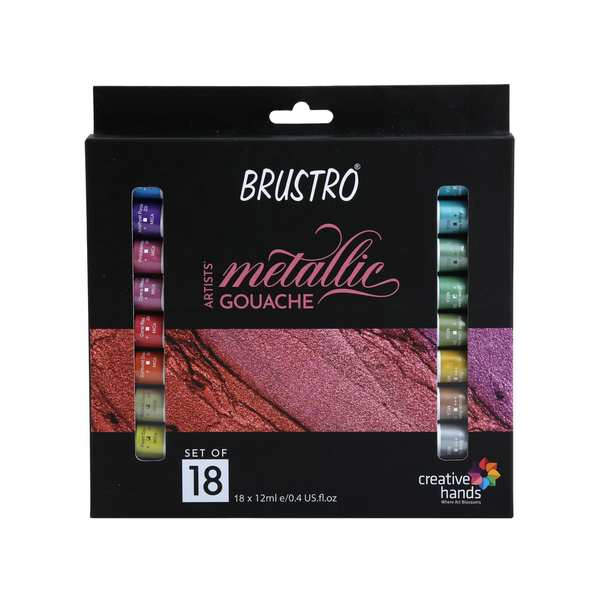 Brustro Artist Metallic Gouache comes in a set of 18 unique, shimmering metallic shades to add highlights and reflective qualities to your artworks in 12ml tubes