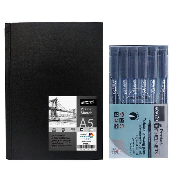 BRUSTRO Professional Pigment Based Fineliner - Set of 6 (Black) & Brustro Artists Stitched Bound Sketch Book, A5 Size, 156 Pages, 90 GSM