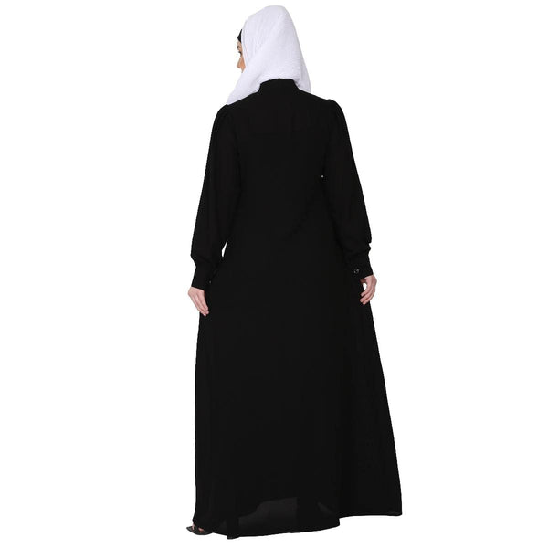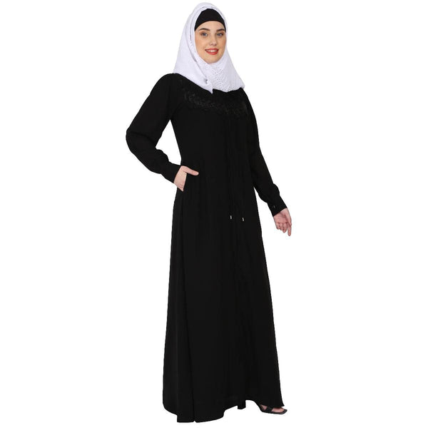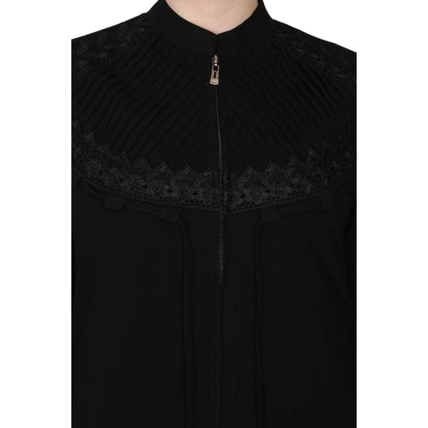 Check this front open zipper Abaya which has pleated and lace work on the chest and gives an amazing look. this abaya has a mandarin collar and cuff sleeves.This article is made of Nida (Matte Finish) fabric which is very Soft, Breathable, Light Weight, and easy to maintain. It gives a good fall to the garment.