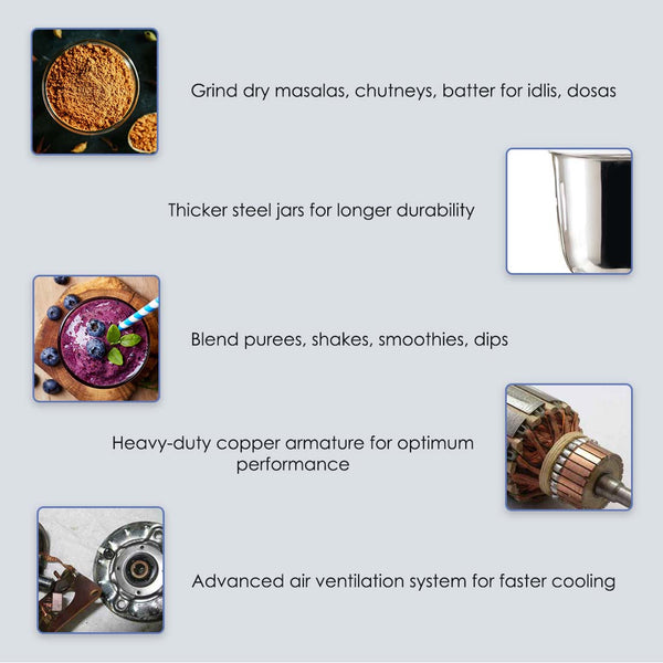 Wonderchef Capri Mixer Grinder 750W is a perfect combination of style and performance. The 750W mixer-grinder helps to grind and blend easily with the stainless steel blades. Now make chutneys and grind masalas easily in the mixer-grinder. The 3 jars have comfortable handle to hold the jar easily. The operative noise level of the machine is 80-90 dB.