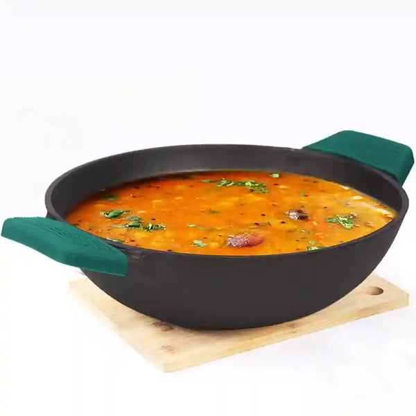 πEASY TO USE: The cast iron cookware generally is great for day-to-day cooking. The cast iron kadai has 2 strong handles with silicone handles for a firm grip for easy and safe cooking.Β