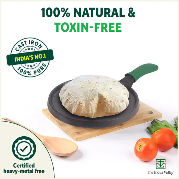 πΏ100% NATURAL & TOXIN-FREE: The Indus Valley Cast Iron Pizza Pan/Tawa for Dosa/Roti/Chappati is 100% natural and toxin-free. Made of pure cast iron, the pre-seasoned flat pan has no chemical coating.Β