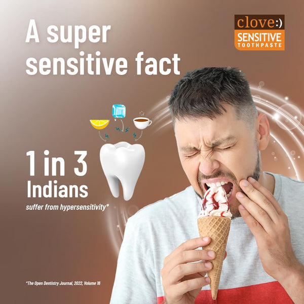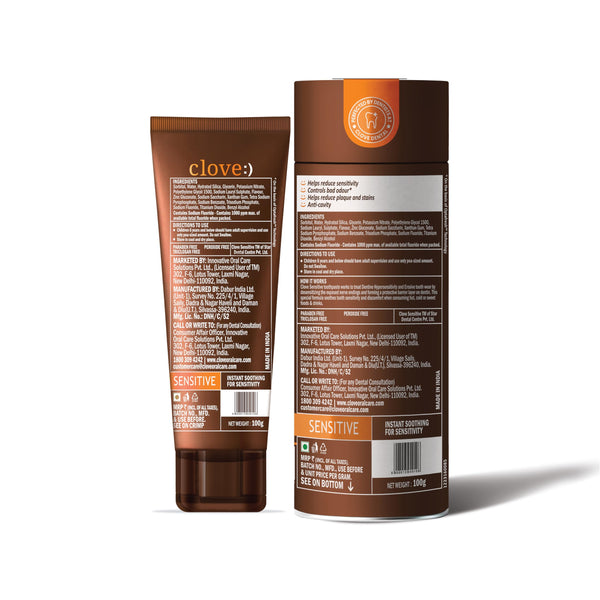 Details: What is tooth sensitivity? Tooth sensitivity occurs when the enamel that protects our teeth gets thinner or when gum recession occurs, exposing the underlying surface, the dentin thus reducing the protection of the root and nerves. When such teeth come in contact with something hot, cold, or sweet, sensations are carried directly to the nerves causing painful sensitivity. Causes for enamel wear and tear: Aggressive brushing, Tooth grinding, Teeth erosion Causes for gum erosion: Aggressive brushing, aging, gum disease. Clove sensitive toothpaste, provides RELIEF from tooth sensitivity with regular use. How to use: Use it like regular toothpaste, twice a day. Apply directly on sensitive teeth for relief. We recommend that you use a toothbrush specially designed for sensitive teeth along with this Clove Sensitive toothpaste. You can also explore the Clove Oral range of toothpaste.