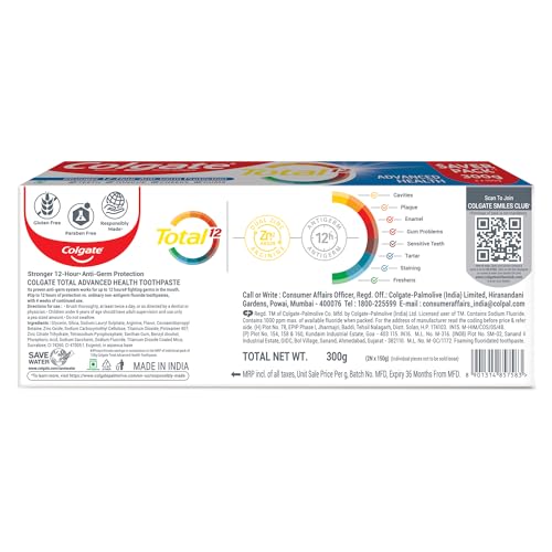 Details: Only 20% of the germs in your mouth are on your teeth, the rest 80% are on gums, tongue and cheeks. Colgate Total antibacterial toothpaste fights germs on teeth, tongue, cheeks, and gums giving you a Whole Mouth Health for 12 hours. Its dual Zinc Arginine technology actively seeks out bacteria in your mouth forming a protective barrier. Colgate Total Advanced Health toothpaste strengthens your teeth by re-mineralizing weakened enamel. It fights plaque to keep your gums healthy and repairs early teeth & gum damage, all to give you a healthier & whiter smile. Colgate toothpaste not only does it fight plaque between your teeth and in all those hard to reach spaces, but also fights bacteria on your tongue, cheeks, and gums leaving your mouth with a fresh breath. Moisturise your brush with water. Put a pea size amount of our Colgate toothpaste on the head of the toothbrush. Insert the toothbrush into your mouth & use gentle, short strokes to brush your teeth. For optimal results, brush twice daily for 2min. Our Colgate Anti-Bacterial toothpaste is certified by the Indian Dental Association and responsibly sourced and made. It is gluten free.