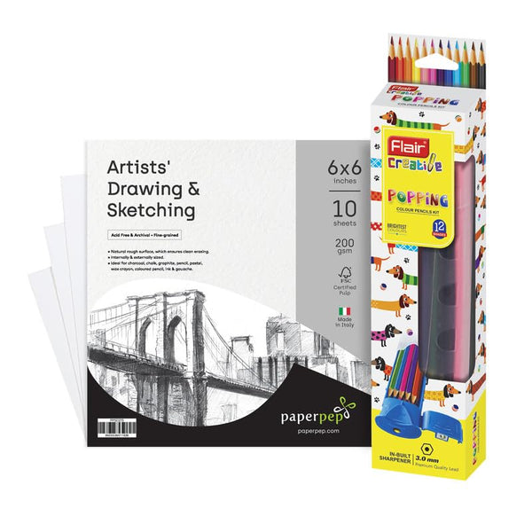 Flair Creative Series Popping Colour Pencils Kit With 6x6 Drawing & Sketching Paper Combo Pack Bianco,White