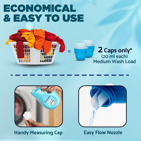 Details: Genteel matic detergent liquid for washing machine is an all-purpose laundry detergent from the house of Godrej. It is the best solution for your everyday clothes. The special strong formula of Genteel washing machine liquid delivers absolute cleansing for whites as well as your coloured clothes. Genteel has an added fabric conditioner that softens the fabric and leaves your clothes with a lingering fragrance. This liquid detergent for Top load washing machine has a functionally superior design that is easy to handle. This liquid detergent for top load washing machine also has a measuring cap which makes it easier not just to measure the right amount of liquid detergent but to pour as well. The pH-neutral no-soda formula prevents your clothes from shrinking and fading. This top load washing machine liquid is ideal for all those clothes that need a little extra care because it's safe and gentle on your expensive lingerie, shawls, silks, woolens and even babywear