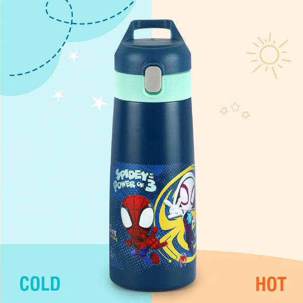 The Cello Kidzbee Gulp Thermosteel Kids Flask is a top-tier stainless steel bottle designed specifically for school and picnics. Its standout feature is the captivating 3D design, featuring beloved Disney and Marvel characters that appeal to children. Beyond aesthetics, this Kids Flask excels in maintaining beverage temperature, keeping drinks hot or cold for an impressive 8 hours. Its user-friendly design includes a convenient push-button lid for effortless access and an interlocking mechanism that prevents unintended spills, ensuring a mess-free experience. Moreover, it boasts an odorless construction, preserving the taste integrity of beverages without any lingering smells. The Cello Kidzbee Gulp Thermosteel Kids Flask not only meets practical needs but also enhances the drinking experience with its engaging design and reliable performance, making it a perfect companion for active kids and their daily adventures.