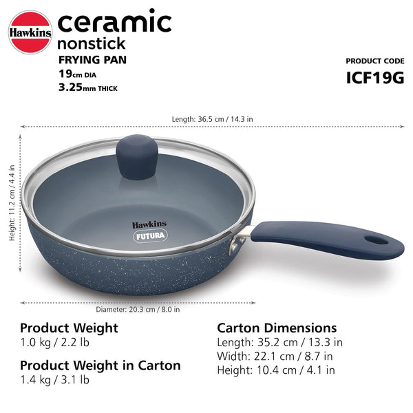 Details: The Hawkins 19 cm Ceramic Nonstick Frying Pan is an induction-compatible frying pan designed to revolutionize your cooking experience. New Hawkins Ceramic Nonstick Inside: This frying pan boasts a cutting-edge ceramic nonstick interior surface that offers excellent release properties. Prepare to be amazed as your dishes require a remarkable 36% less oil while retaining their delectable flavors. Enjoy tasty and healthier meals with every use. Not Spoilt by High Heat: Unlike traditional nonstick pans, this ceramic wonder is not spoilt by high heat. Cook crisper and tastier dishes with confidence, knowing that this pan can handle the heat without compromising its performance. No PTFE, PFOA, PFAS, or Heavy Metals: Embrace a more hygienic and healthier cooking environment with the ceramic-based revolutionary nonstick coating. Say goodbye to harmful chemicals, as this pan is free from PTFE, PFOA, PFAS, and heavy metals, ensuring your well-being with every meal. German Ceramic: Crafted with high-quality German ceramic, this frying pan is built to last. Enjoy the durability and longevity of a pan that can withstand the test of time, meal after meal. 3.25 mm Extra-Thick: The 3.25 mm extra-thick construction ensures rapid and even heating, so you can achieve perfect cooking results every time you step into the kitchen. Attractive Ceramic Coating Outside: Not only is the interior impressive, but the exterior also features an attractive ceramic coating. This coating is scratch and stain-resistant, ensuring that your frying pan will look new and appealing for years to come. No-Hassle Cleaning: Bid farewell to the tedious task of scrubbing stubborn stains and pits. This frying pan is designed for no-hassle cleaning, leaving no stains or pits behind. Sturdy, Stay-Cool Silicone Handle: The Hawkins frying pan features a sturdy yet soft-touch silicone handle that stays cool to the touch. This handle provides a firm and comfortable grip, enhancing your cooking experience and safety. Create healthier and tastier dishes, and enjoy effortless cleaning with the Hawkins 19 cm Ceramic Nonstick Frying Pan. Say yes to delicious, hassle-free cooking and make this frying pan a staple in your kitchen today!