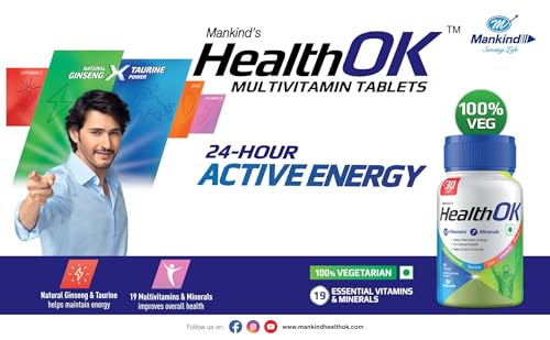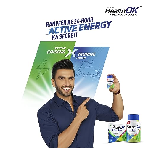 Health OK Multivitamin with Natural Ginseng, Taurine power, Daily Energy, alertness, Vitamin D, C & other 18 multivitamins minerals, for Overall Health, 30 Tablets (Veg) x Pack of 1