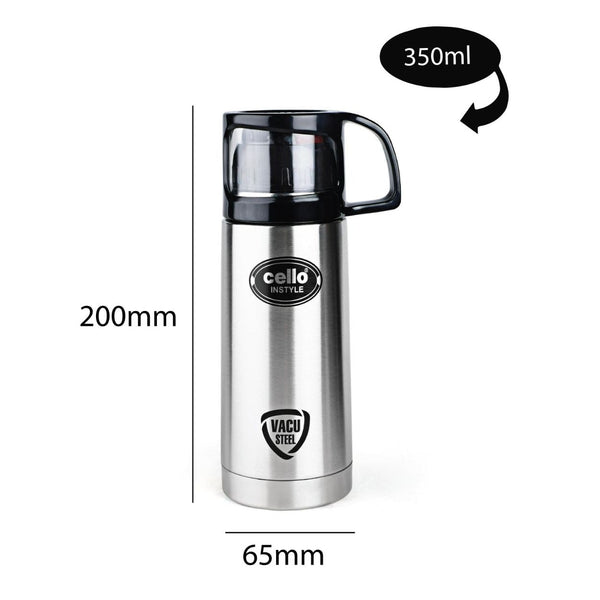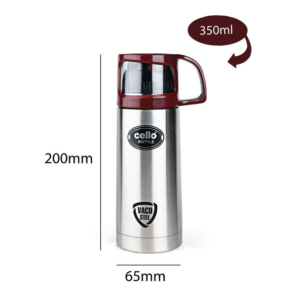 Introducing the Instyle Flask, a 350ml Vacusteel Water Bottle by Cello, designed to cater to your beverage needs all year round. This stainless steel flask is your perfect companion during scorching summers and freezing winters, thanks to its thermo seal technology and vacuum insulation. With this special feature, it retains the temperature of your drink, keeping hot beverages hot and cold ones refreshingly chilly for extended periods. Its wide mouth easily accommodates ice cubes, and the robust cap ensures a tight seal, preventing any leaks and eliminating the need for constant water reheating. This flask also comes with a smart jacket/pouch for extra protection, adding convenience to your hydration routine. Made with high-quality steel and inner copper coating, it excels in heat retention, and its 100% vacuum-insulated stainless steel body maintains beverage temperatures effectively