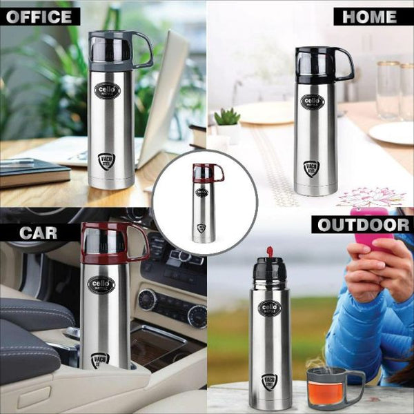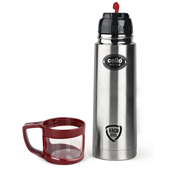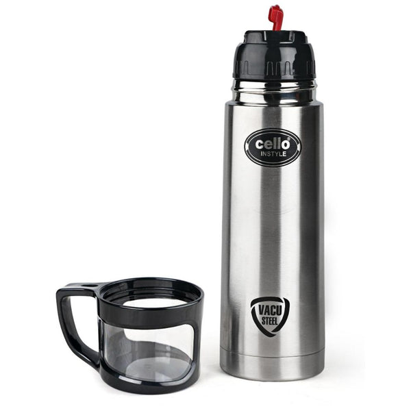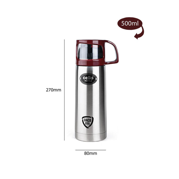 Introducing the Instyle Flask, a 500ml Vacusteel Water Bottle by Cello, designed to cater to your beverage needs all year round. This stainless steel flask is your perfect companion during scorching summers and freezing winters, thanks to its thermo seal technology and vacuum insulation. With this special feature, it retains the temperature of your drink, keeping hot beverages hot and cold ones refreshingly chilly for extended periods. Its wide mouth easily accommodates ice cubes, and the robust cap ensures a tight seal, preventing any leaks and eliminating the need for constant water reheating. This flask also comes with a smart jacket/pouch for extra protection, adding convenience to your hydration routine. Made with high-quality steel and inner copper coating, it excels in heat retention, and its 100% vacuum-insulated stainless steel body maintains beverage temperatures effectively