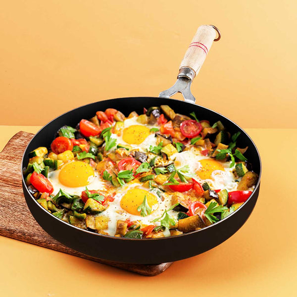 🌿100% NATURAL & TOXIN-FREE: The Indus Valley’s Iron Frying Pan/Skillet (with Wooden and Bakelite Handle) provides the best cooking experience without compromising your health and ease of cooking. This pre-seasoned iron pan can be trusted to be chemical-free and food-safe.