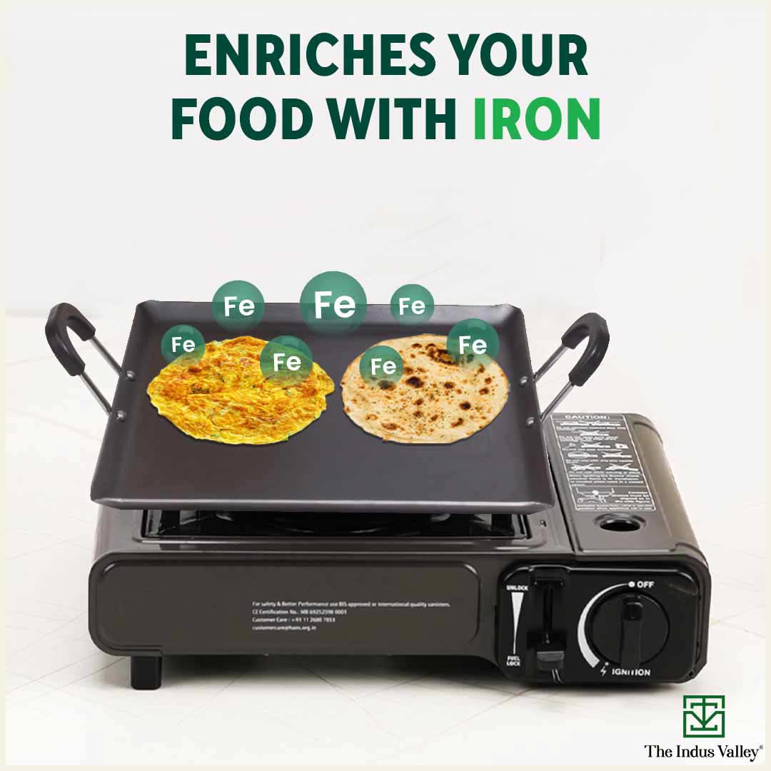 💪100% NATURAL AND FOOD-SAFE: The Indus Valley Iron Tawa (square) with double Bakelite handle is the best alternative to non-stick tawa. It is 100% natural and completely food-safe.