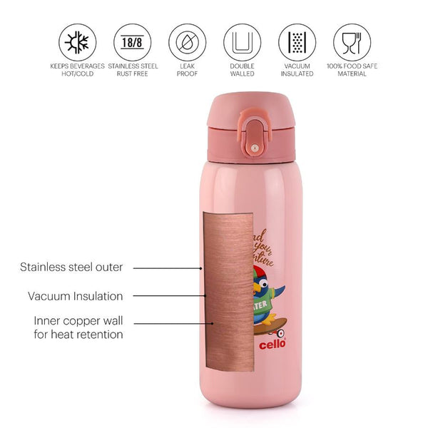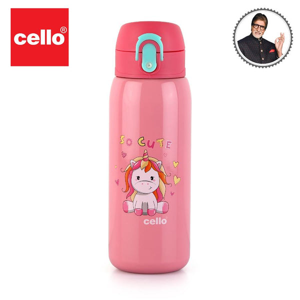 Introducing "Junior" by Cello Kidzbee - the perfect water bottle companion for your school-going kids! With a generous 475ml capacity, it's designed with adorable animal and bird motifs, available in vibrant Green, Pink, Orange, and Peach. This bottle fits seamlessly into any school backpack's bottle holder. Junior boasts impressive features: lightweight and compact, it offers a one-touch push button with a secure lock and a covered easy-drinking spout. Thanks to double-wall vacuum insulation, it keeps water cool on scorching summer days. Plus, the wide cap with a flip top ensures zero leaks, even when laid on its side or shaken. Make hydration fun and hassle-free for your little ones with Junior!