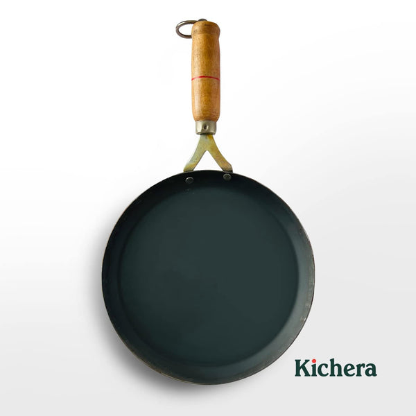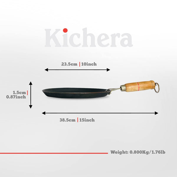 Details: Premium Quality Kichera PURE IRON FRY PAN. Make tasty and healthy Fish & Omellete with our pure iron Fry Pan pre seasoned and ready to use. No harmful chemical coatings. Adds Iron ( Fe) into Food. Heavy bottom helps in even cooking and retains maximum nutrients. Retains heat longer to keep your food warm & fresh for long. Comfortable long wooden handle for better grip. Large surface for cooking large quantities of food. Easy to maintain with its smooth finish. Naturally Non stick with regular seasoning. Compatible with induction, camp-fire, and gas stove. Last lasting for generations.