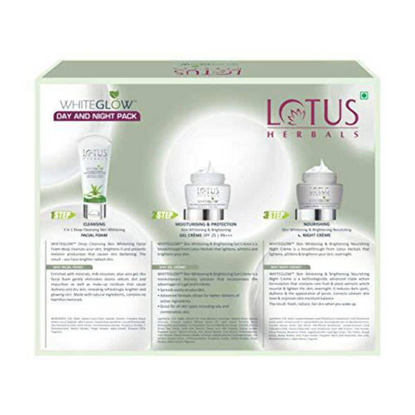 Details: The WhiteGlow Day and Night Pack is a perfect start to your day, right from cleansing to moisturisation and skin whitening, ending with soothing night nourishment. WhiteGlow 3 in 1 Deep Cleansing Facial Foam -( Net Qty -100G ) is specially curated to cleanse the skin deeply. It is a hydrating, super gentle cleanser that gets right to work washing away dirt, makeup, and excess oil. WhiteGlow Skin Brightening Gel Crème -( Net Qty -60G ) is the best skin whitening cream that delightfully blends into the skin, leaving it smooth, radiant, and hydrated all day long. The SPF 25 provides much-needed sun protection too. WhiteGlow Skin Brightening and Nourishing Night Creme -( Net Qty -60G ) is a perfect leave-in night treat for tired skin as it strengthens the skin barrier, promotes cell growth, and enhances your glow.