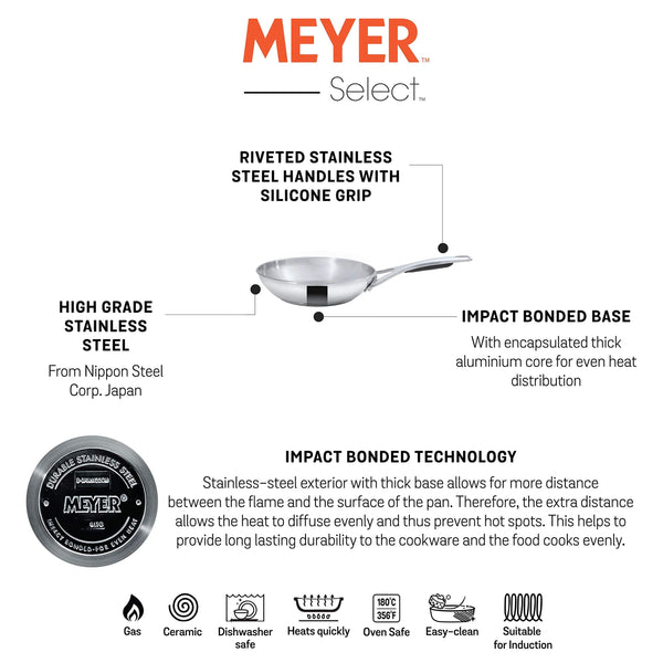 Details: High-grade proprietary nickel free has 0% Nickel, 0% Molybdenum, 0% Copper and is 100% safe for consumption. Other variants like SUS304 have 8% to 10.5% Nickel, and traces of Manganese, Sulphur and Phosphorus. High grade proprietary nickel free stainless steel from Nippon Corp. Japan that will last you with ultimate strength and durability as it has superior pitting resistance than any other ordinary stainless steel cookware. Impact bonded base for even heat distribution.Suitable for all cooktops including induction. Cast stainless steel riveted handle with silicone grip.Meyer provides the warranty of 10 years on its Select range.