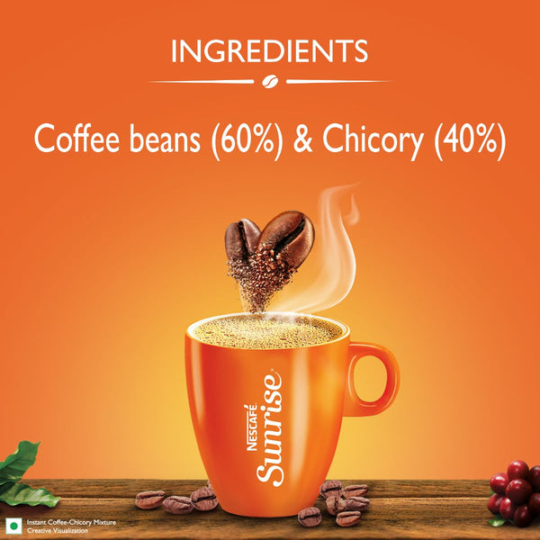 Details: "Start your day bright with NESCAFE SUNRISE! It all starts with handpicked beans from coffee farms in South India. These coffee beans are SLOW ROASTED to develop the perfect aroma, which is retained using our world-class expertise and captured in RICH AROMA GRANULES. Enjoy the great aroma and taste in every cup with NESCAFE SUNRISE. Usage: Simply follow the instructions on the back of the pack and mix the coffee granules to hot water, sugar and milk to release the rich aroma in your cup every morning. Storage Information: On opening, transfer the contents of the pack into an airtight container. Always use a dry spoon. "