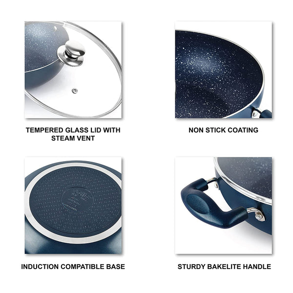 Oxford Non-Stick Kadhai features a superior non-stick coating, guaranteeing hassle-free cooking and easy cleanup by ensuring food release without any sticking. Its versatile compatibility makes it suitable for gas stoves, electric cooktops, and induction hobs, offering efficient cooking on various surfaces. Crafted from high-quality aluminum, this kadhai is built to last, resisting warping and delivering long-lasting performance.