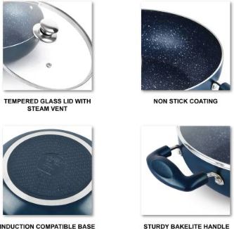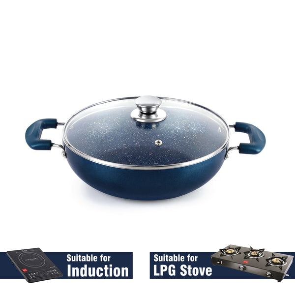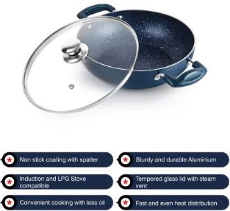 The Oxford Non-Stick Induction Base Kadhai with Glass Lid is crafted with a superior American heritage Dupont non-stick coating, this versatile cookware ensures healthy cooking by minimizing the need for excess fats and oils. Its compatibility with both gas stoves and induction cooktops offers convenience, while the quick and even heat distribution guarantees efficient cooking.