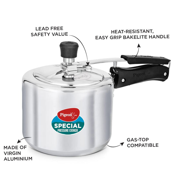 Details: Whether it's for cooking rice or steaming veggies, this 3 L pressure cooker Inner Lid from Pigeon makes cooking easy. Made of High-grade Virgin Aluminium, this pressure cooker comes with features such as a Precision Weight Valve, User-friendly Handles, a Metallic Safety Plug, and a Gasket Release System to make your cooking experience safe and convenient.