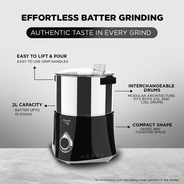 Preethi Stainless Steel Astra Expert Table Top Wet Grinder With Food Processor, 2 Liter (Black) 150 Watt