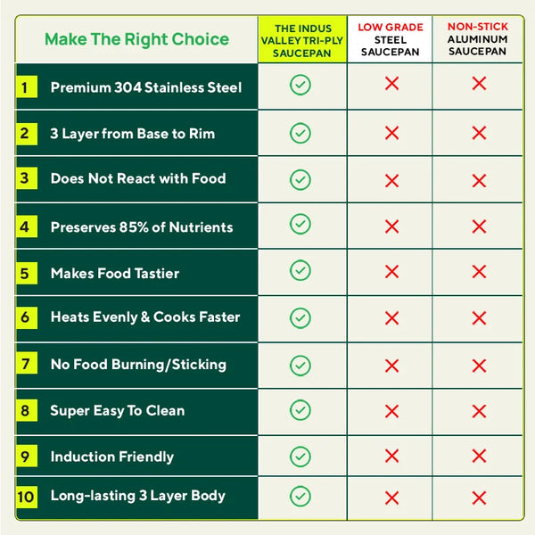 👌100% TOXIN-FREE: The Indus Valley’s Premium Stainless Steel Saucepot with Tri-ply Sandwich Bottom is 100% food-safe. This toxin-free Sauce pot makes zero compromises on your health and ease of cooking.