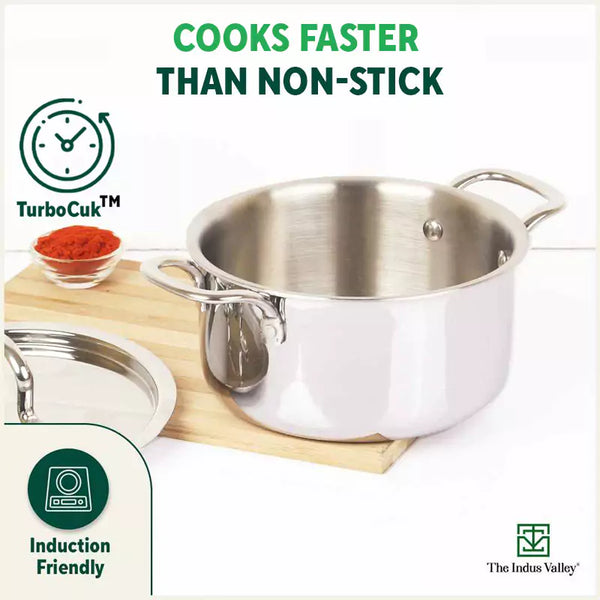 👌100% TOXIN-FREE: The Indus Valley’s TurboCukTM Tri-ply Stainless Steel Casserole/ Stock Pot/ Sauce Pot/ Rice Cooking Pot is made from 100% food-safe metals. Also called a steel casserole or stainless steel stock pot, this cookware is entirely free from chemical coating.