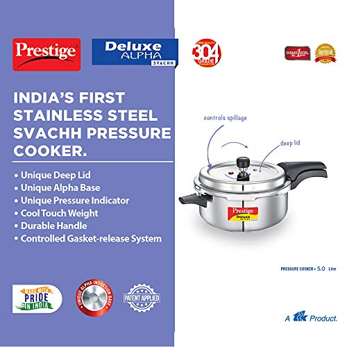 Details: The Prestige Deluxe Alpha Svachh Pressure cookers are made using the best quality Stainless steel, which makes it perfect for any kitchen. Its unique Alpha base is designed for even distribution of heat and is also induction compatible. What's more, it also features built-in safety mechanism in the form of pressure indicators, safety plug and controlled Gasket-release system. Also, the Svachh lid contains any spillage that might occur during the course of cooking and prevents the messy liquid from dripping down. So, go ahead and bring home the Deluxe Alpha Svachh Stainless Steel Pressure cooker, it's yet another Prestige Product you can trust.
