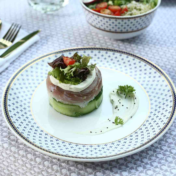 The Sicilia Royal Blue collection is the perfect balance of traditional design thought with a contemporary outlook. This collection has rich royal blue colour with real gold accents. Each piece of this collection portrays the artisan’s eye for detailing. The touch of gold rim around the blue base makes it a coveted piece. They undergo three stages of firing and stringent quality check to attain the finish. The colours and gold used are food safe. Match it with its complementary pieces (sold separately) to curate a lavish dinnerware set, also perfect for gifting.