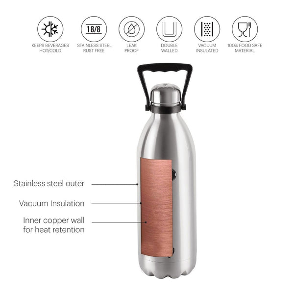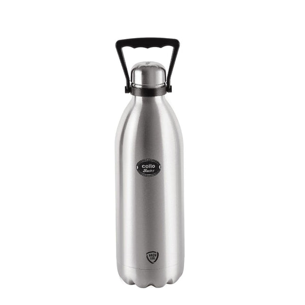 Introducing the Swift Flask by Cello, a 1500ml Vacusteel water bottle engineered for optimal temperature retention, perfect for both hot and cold beverages. Its classic design features a small mouth and neck to enhance heat preservation, ensuring icy cold drinks and piping hot beverages stay refreshingly refreshing. The modern click-press inner lid, backed by Thermo-seal technology, seals in heat, while the small mouth allows spill-free drinking and pouring. Compact and sleek, it's your ideal companion for modern-day living.