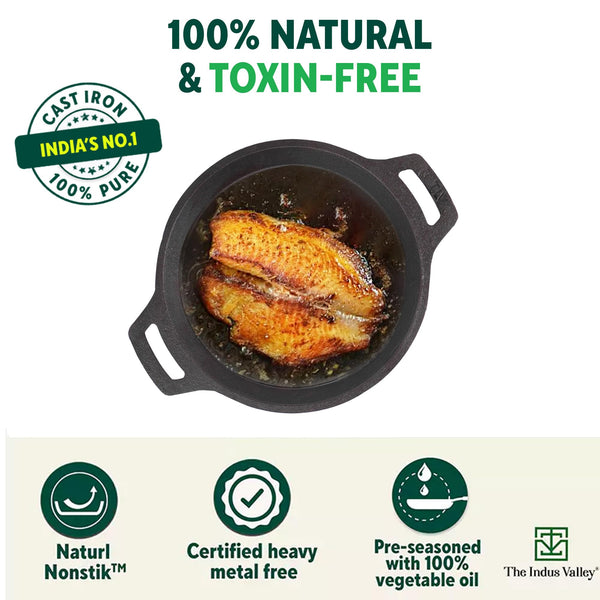 The Indus Valley Preseasoned Cast Iron Fish Fry Pan With Double Handle| Medium 22.4Cm/ 8.8Inch, 1.5Kg | Induction Friendly | Nonstick Fish Fry Pan, 100% Pure & Toxin Free, No Chemical Coating, Black