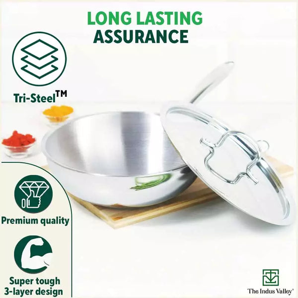 👌100% TOXIN-FREE: The Indus Valley’s TurboCukTM Triply Stainless Steel Wok/ Frying Pan/ Skillet with Lid is made from 100% food-safe metals. The curry wok is totally free from chemical coatings.