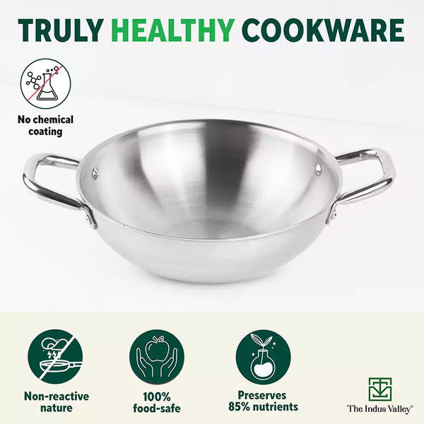 🙅NON-REACTIVE NATURE: Trust the chemical-free and food-safe Tri-ply Stainless Steel Frypan and Kadhai for cooking your favourite food in it because it does not react with your food.