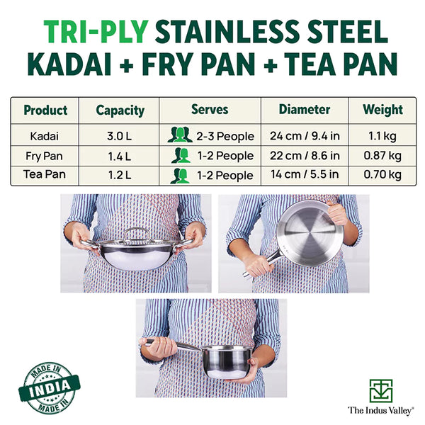 👌100% TOXIN-FREE: The Indus Valley’s TurboCukTM Tri-ply Stainless Steel Cookware Combo: Kadai / Kadhai + Frying Pan/Skillet + Saucepan/Tea pan/ Milk pan will give you a highly satisfying cooking experience.