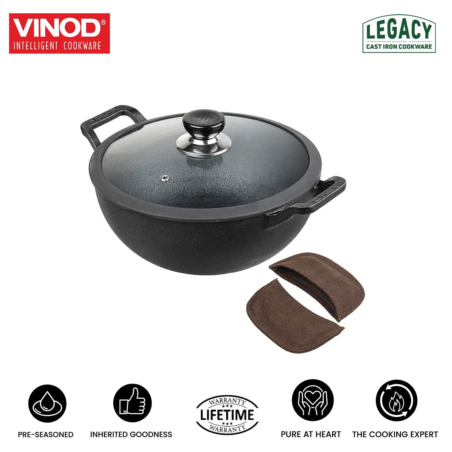 Details: Indian kitchens have honed the cast iron cookware since times unknown. The cast iron cookware can be used on stove tops, grills as well as in the oven which makes it possible to cook a large number of cuisines by using the same cookware. That means minimal space consumption and maximum utility which is just one of the benefits of investing in the cast iron kadai, cast iron tawa or cast iron frypans. Vinod Legacy Cast Iron is Multi-Functional where you can Bake in it, Fry in it, BBQ in it. Perfect for delicious curries, sautΓ©ing, frying, searing, roasting and getting that authentic βcharredβ flavour in your daily cooking