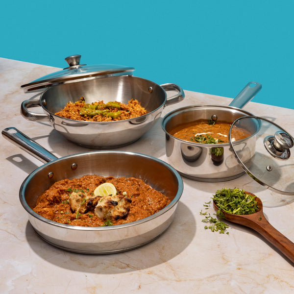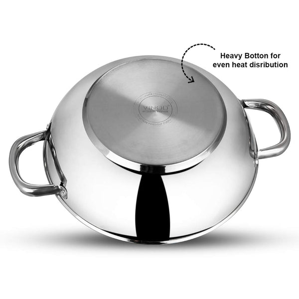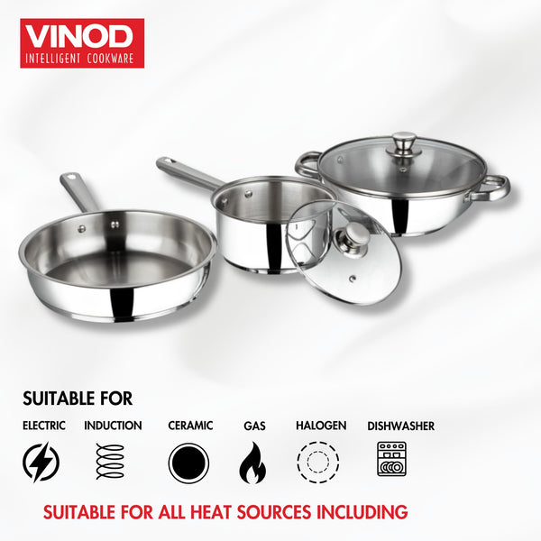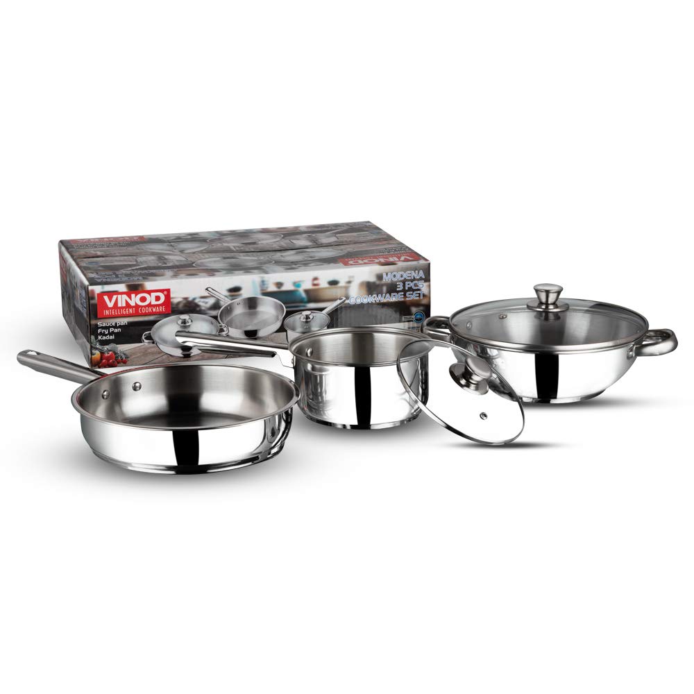 Details: Vinodβs 3 pc Modena stainless stainless induction based cookware is GO TO set for all your meals, whether it is to boil Milk for breakfast in 1.5ltr saucepan that comes with glass lid or cook your favourite lunch in 2.8ltr Kadai with glass lid or simply toss a aloo tikki or eggs for your evening snack in our 24cm frypan.They are made from food grade high quality stainless steel using thicker stainless steel for longer use. To ensure you uniform and faster cooking we have used a layer of aluminium at the bottom. We use a base of stainless steel of Grade AISI 430 grade. This is magnetic and allows you to use your induction cooktop.The mirror finish of the body and the stainless steel layer at the bottom stays bright, and looks as good as new after years of use. It also makes the saucepot easy to clean and hassle free. They come with riveted stay cool handles which allow you to work with them effortlessly.