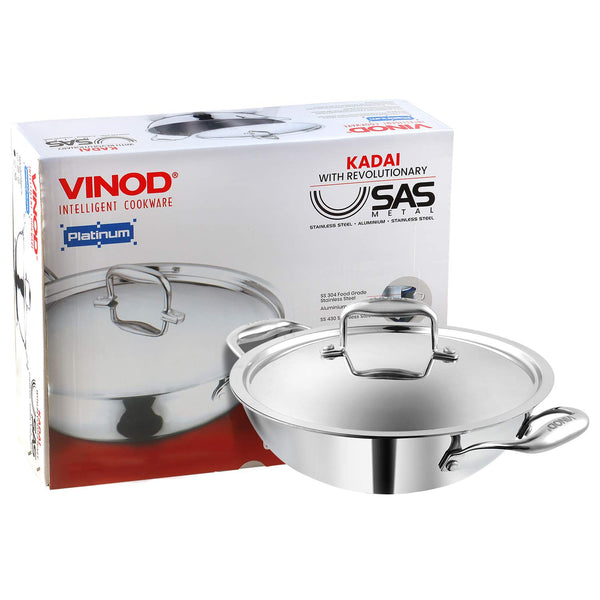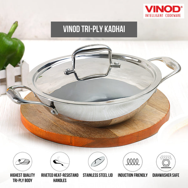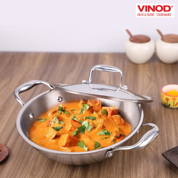 Details: The Kadai is a staple utensil in Indian kitchens for centuries. Mainly used to cook vegetables, this Kadai brings the best to your kitchen! The Integrated layer of aluminium right through, even at the bottom helps in faster cooking and in efficient heat retention that helps to keep food warm for a long time. Its Triple layer with the superior Food Grade 18/8 stainless and SS 430 magnetic stainless steel that supports Induction cooking. Cookware range for Industrial and Home Chefs with 60 Months Warranty.
