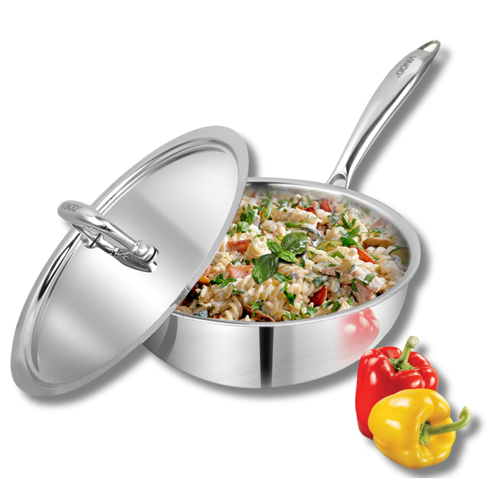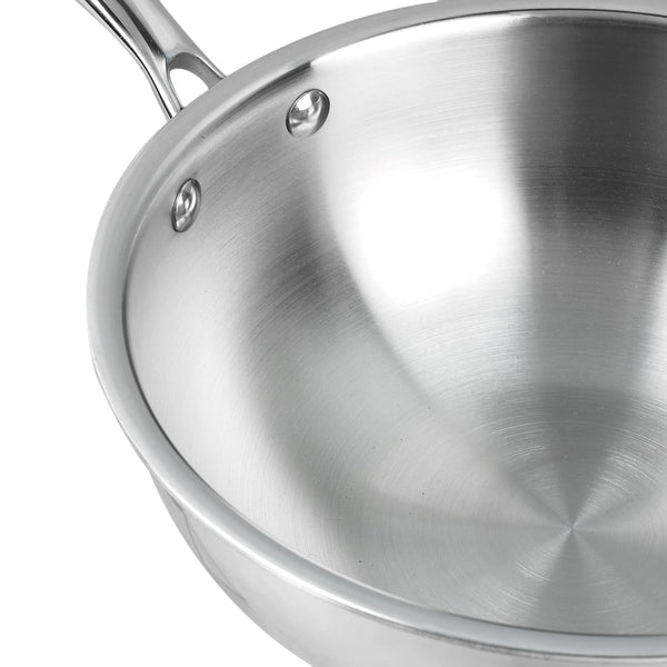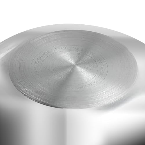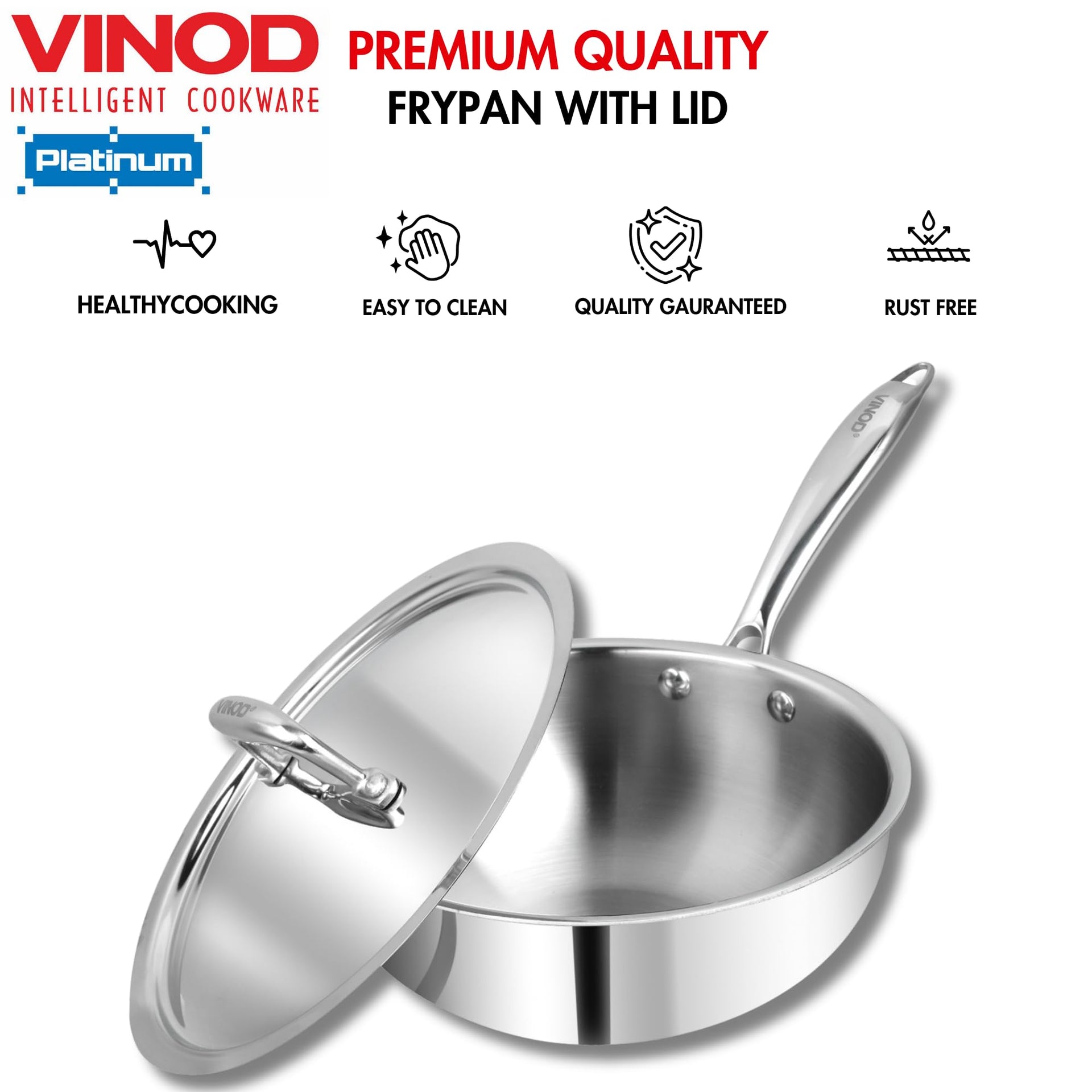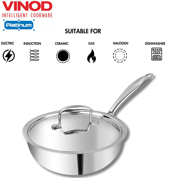 Details: Vinod Platinum triply stainless steel series is made up with SAS technology, which is a triple layer construction of stainless steel, aluminium and stainless . The inner layer is made up of food grade 18/8 stainless steel, which is hygienic stainless steel and rust free.The middle layer is consists of aluminium throughout, this ensures in even heat distribution and uniform cooking of food. The third layer is made of 430 stainless steel for induction compatibility.