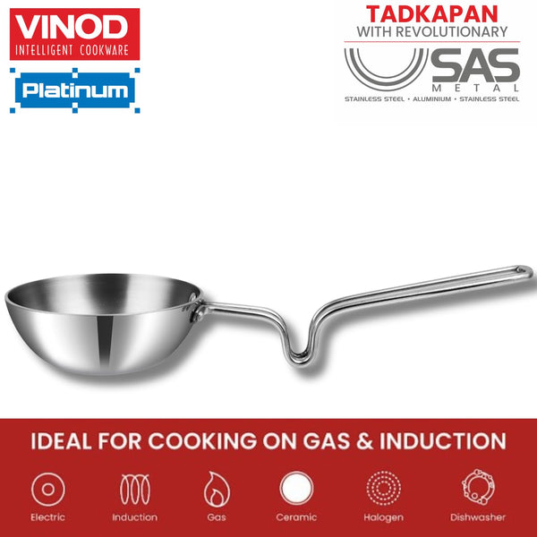 Details: Vinod Platinum triply stainless steel series is made up with SAS technology, which is a triple layer construction of stainless steel, aluminium and stainless steel The inner layer is made up of 18/8 food grade stainless steel, which is hygienic stainless steel and rust free.The middle layer consists of aluminium throughout the cookware, this ensures even heat distribution and uniform cooking of food. The third layer is made of 430 magnetic stainless steel for induction compatibility. The triply stainless steel tadka pan comes with riveted stainless steel handle which does not loosen up thus ensuring maximum durability. The triply stainless steel tadka pan is compatible across all heating platforms like gas, induction, ceramic, infrared and hotplate. The Vinod Platinum Triply Stainless Steel Tadka Pan (Seasoning Pan) is an essential kitchen tool especially for Indian kitchens where food preparation includes tempering the dishes. Indian dals and curries need an additional tadka to make the dish perfect. Temper your dals, kadhis, dhoklas and sabzis with Vinod Tadka Pan!