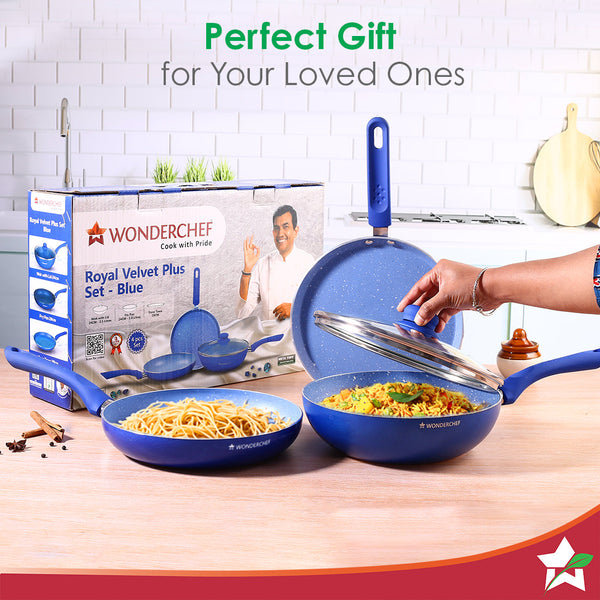 Add royalty to your kitchen with Wonderchef Royal Velvet pans. The sets of these pans are available in multiple attractive color options. They enhance your creativity and add a touch of sophistication to your kitchen.