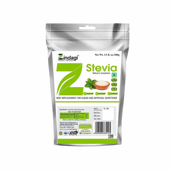 Zindagi Stevia Powder Sachets - Pure Stevia White Powder - Sugar Free Sweetener, 100 Sachets