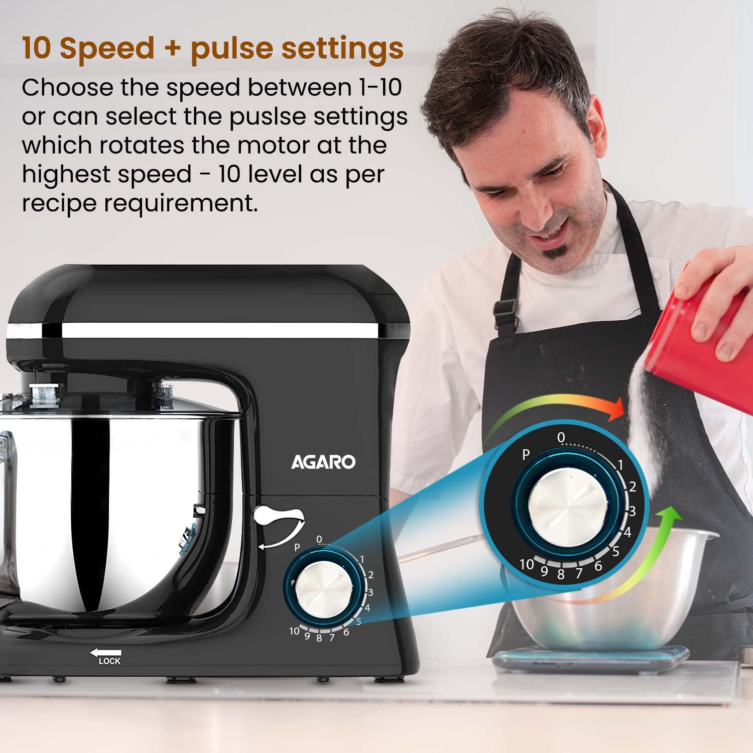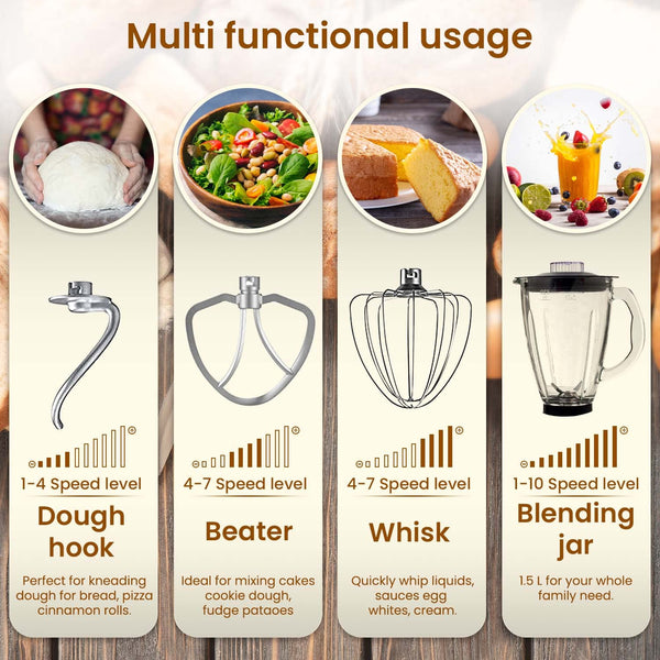 AGARO Imperial Stand Mixer,1400W with 6L SS Bowl, 1.5L Blending Jar,10 Speed With Pulse Function, 100% Copper Motor, Includes Blending Jar, Whisker, Beater, Dough Hook, Egg White Separator, Black