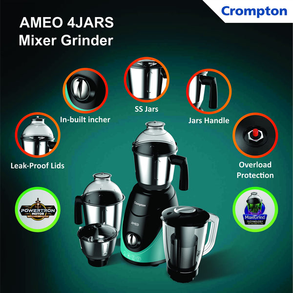 Crompton Ameo 750-Watt Mixer Grinder with MaxiGrind and Motor Vent-X Technology (3 Stainless Steel Jars and 1 Juicer Jar, Black & Green) (AMEO-4JARS)