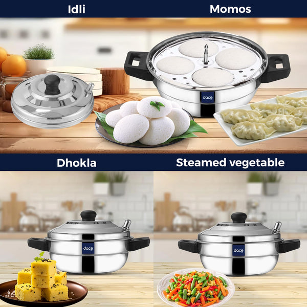 DACE Lite 3 Plate Ss Idli Cooker With Whistle Indicator | Idli Cooker Stainless Steel Pot Steamer| Steel Idli Maker With Silver Lid- 3 Plates- 12 Idlies, 0.5 Litre