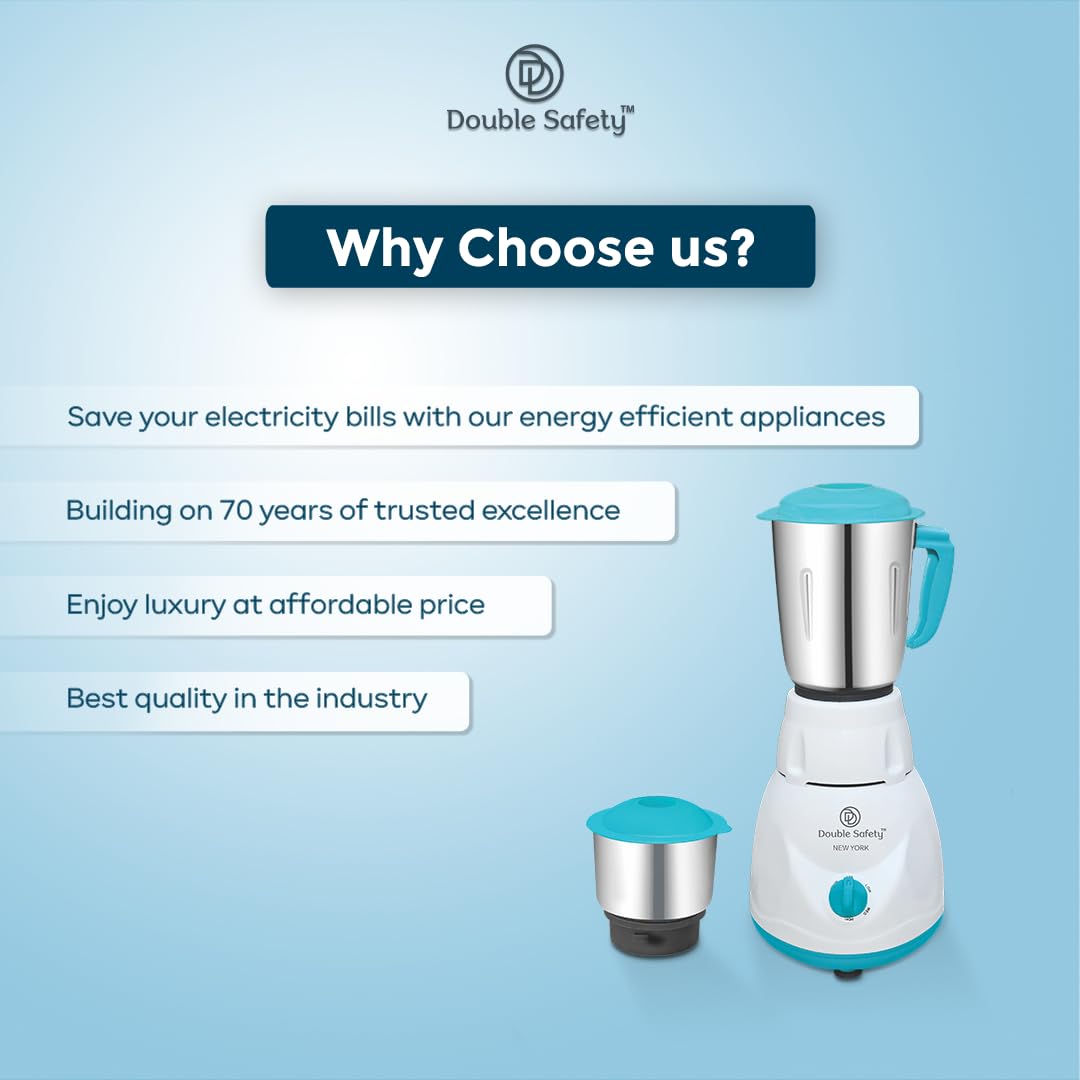 Double safety New York Mixer Grinder 500 watts | Chutney Jar and Liquidizing jar to make chutneys, Milkshake, Smoothies, Puree | High Speed | Superior Mixi for Kitchen | Stainless Steel Jars